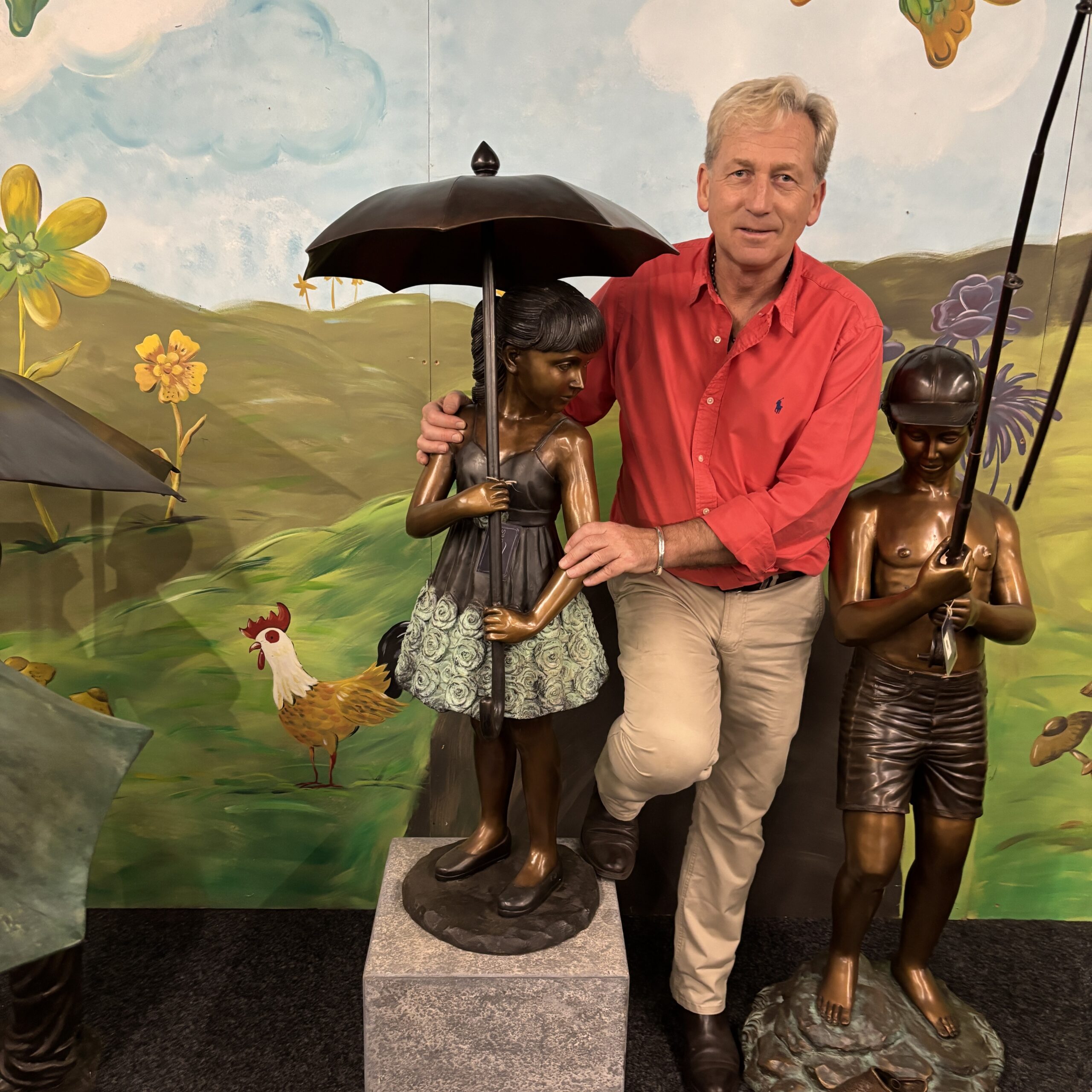 The Bronze April Showers Sculpture Girl Holding Umbrella is a lovely piece that could be placed anywhere in the home. In addition she would look lovely on the patio near a rockery. For instance she is a very pretty and easy on the eye statue. Consequently she will become a favourite piece among the family where ever she lives. For example she has very lovely detail & this is a very fine sculpture.