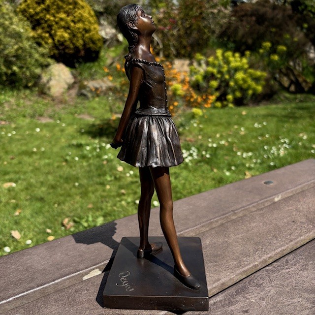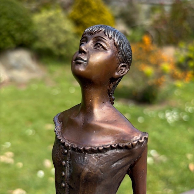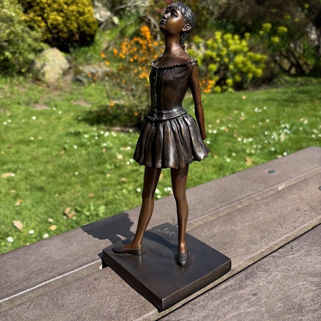 This Bronze Ballet Dancer Sculpture is inspired by Degas’ famous “Little Dancer” and captures a quiet moment of poise and anticipation. The figure stands with head gently lifted, suggesting dedication, discipline, and youthful aspiration.