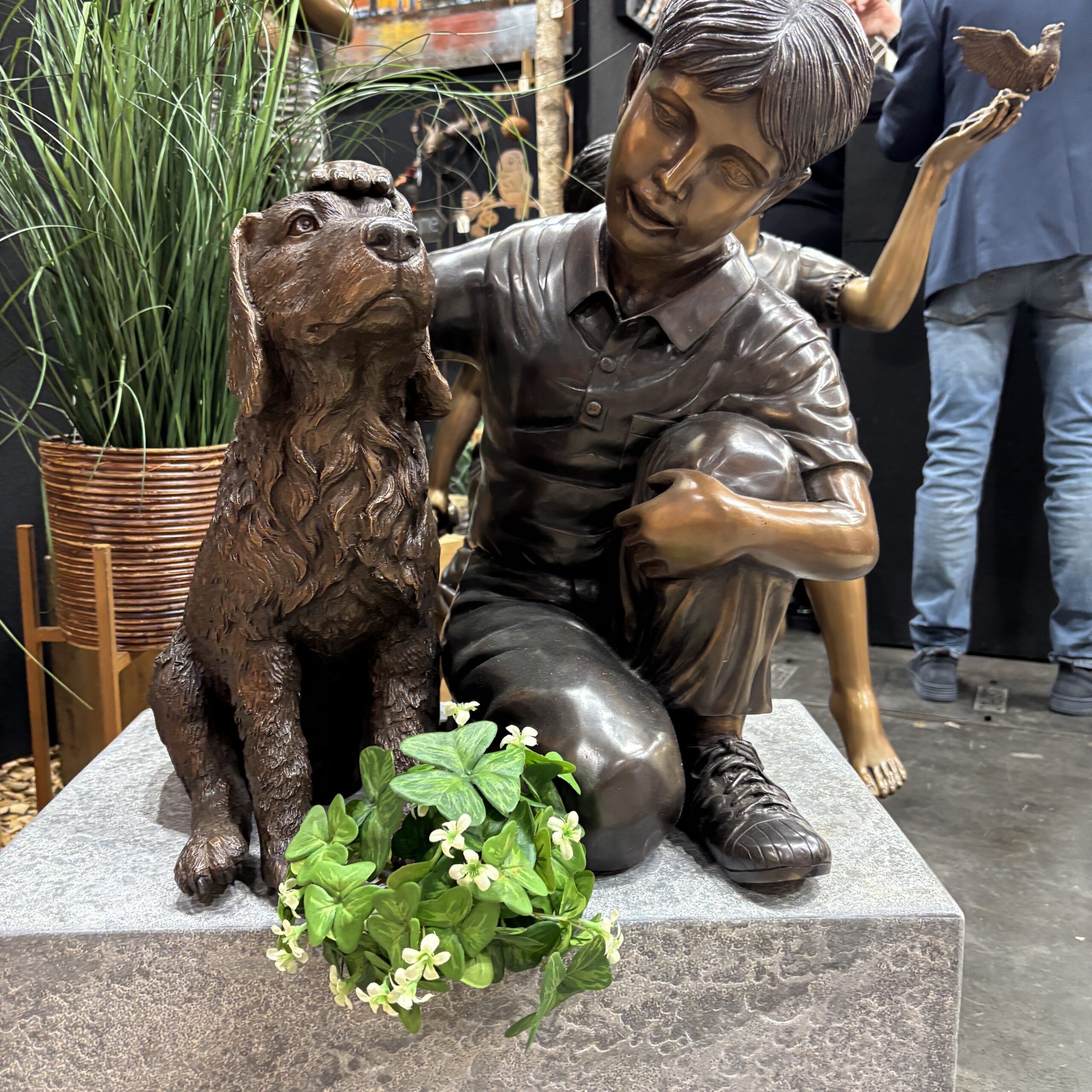 Bronze Boy With Pet Spaniel Adorable Puppy Garden Sculpture the master and his little Dog. Indeed a wonderful garden ornament that could look lovely in any part of the garden. In addition a delightful large feature that will capture everyone’s imagination. For example could be sited near a water feature or over a stream, or next to a pond. Also, Dog lovers will love this piece enchanting piece.