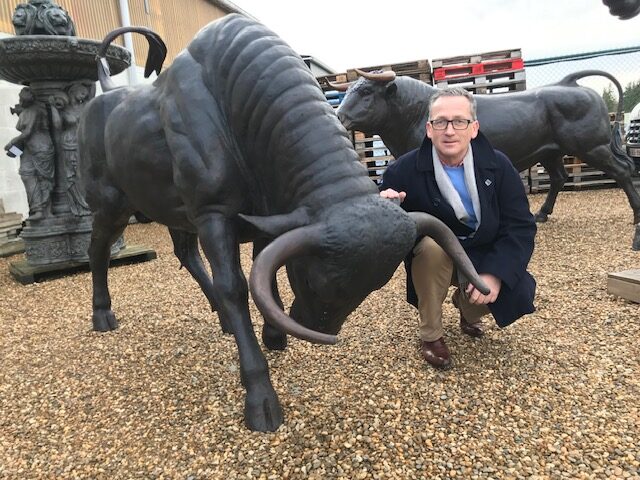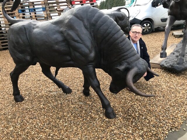 This Bronze Bull Charging Life Size Garden Animal Art Sculpture about 8ft long with tail whipping into the air, approx 6ft high. This massive Bronze Bull weighs around half a ton. He has true presence therefore is likely to become a local landmark wherever he is placed. On a large pedestal would make him even more awesome putting his head at a higher level. Every part of his body is covered in rippling muscles.