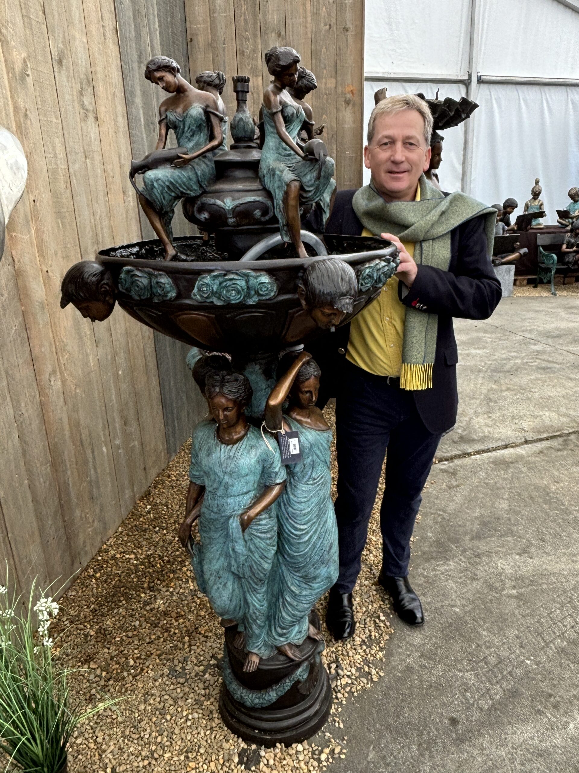 This large bronze fountain presents three draped female figures supporting an upper bowl from which water flows gently. The composition is symmetrical and composed, creating a sense of balance and permanence that reflects classical European garden sculpture.