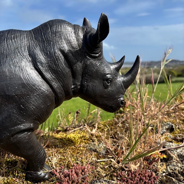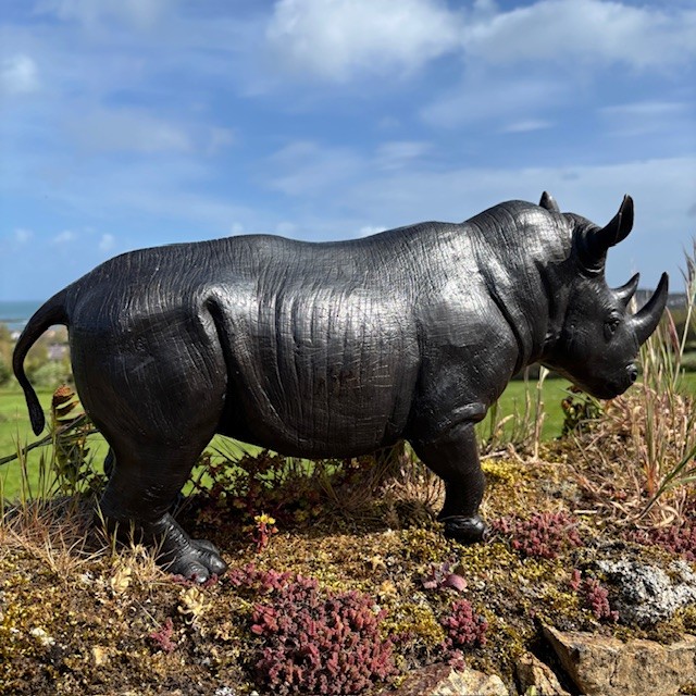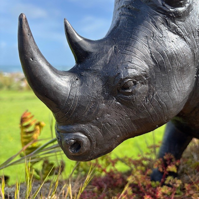 A powerful Bronze Guardian Rhino Garden Sculpture with a commanding and grounded presence. The forward stance creates a strong sense of protection and resilience. Finely detailed textures across the body add depth and realism. The rich bronze patina enhances its bold and timeless character.