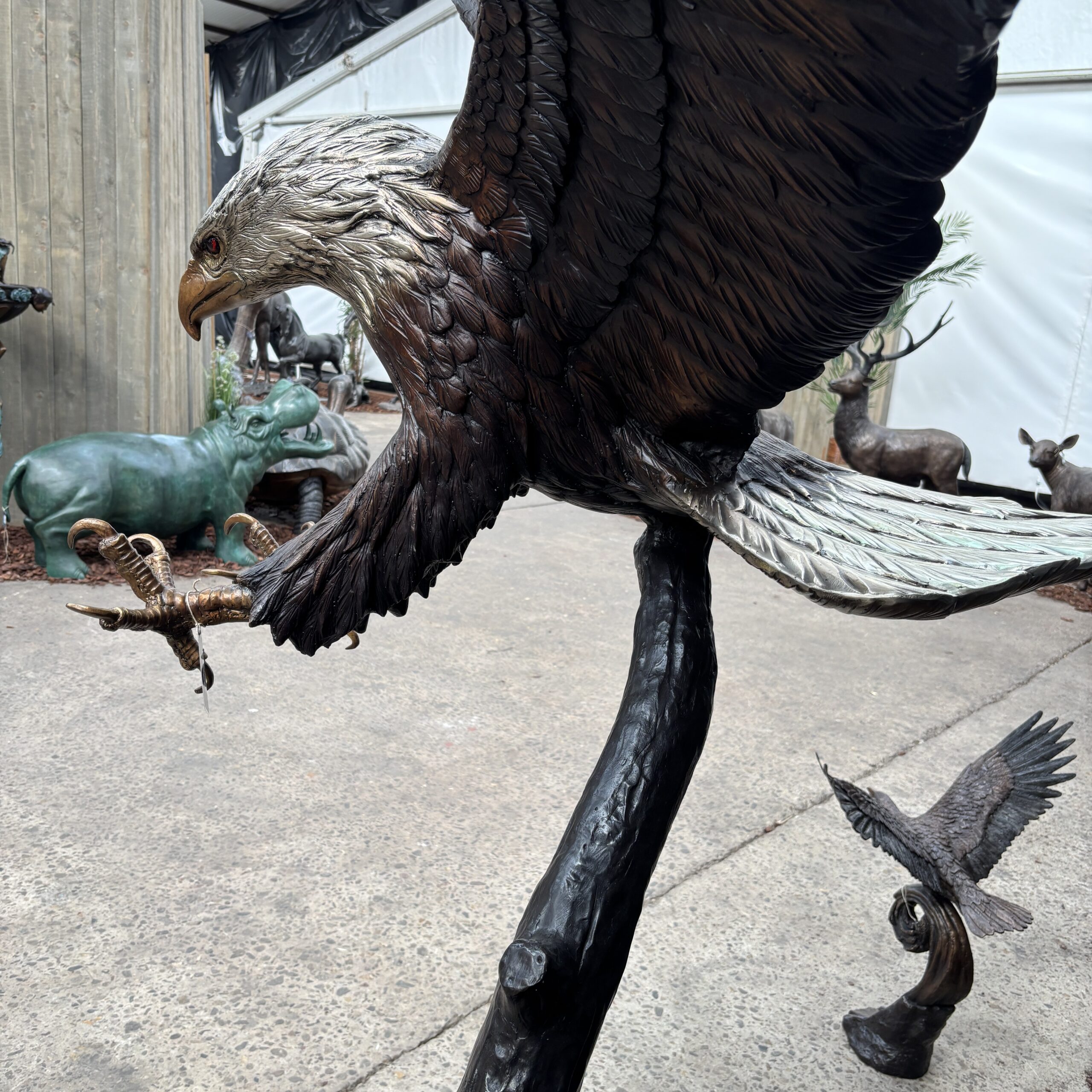 The naturalistic tree trunk base adds height and elegance. At the same time, it creates movement, as if the eagle has just swept down from the sky. The detailed feathers and hand-finished patina add depth and realism to the sculpture.