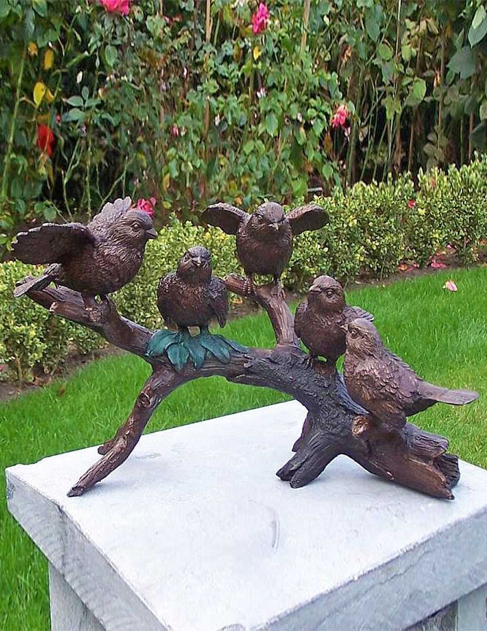 The five sparrows sit together on a small branch. Because of this, the sculpture creates a natural and animated scene.