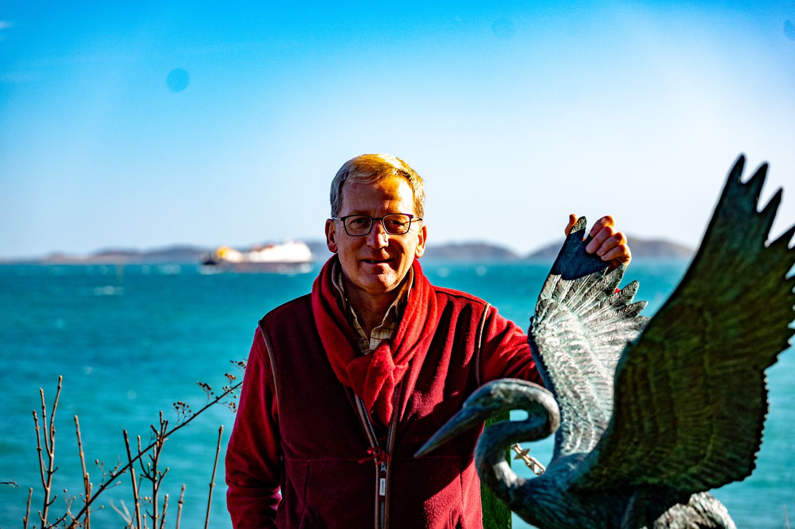 When positioned slightly higher, the open wings gain extra visual impact. Light and shadow move across the verdigris surface throughout the day.