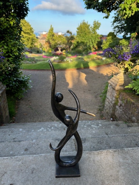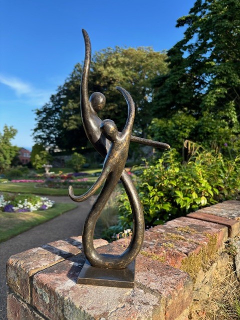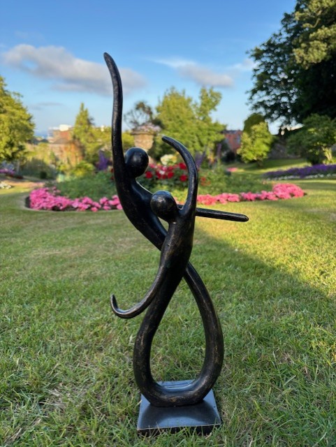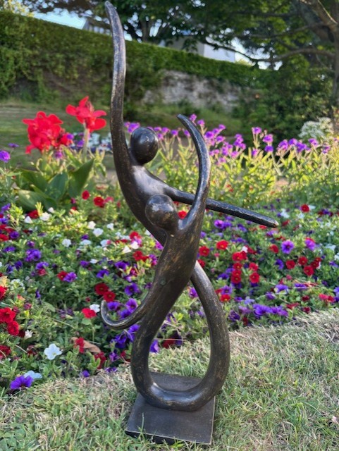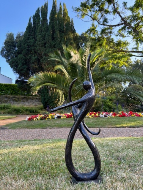 The flowing lines create a natural rhythm between the two figures. This gives the piece a sense of connection and shared movement. As light changes, the open form allows subtle shadows to develop, adding depth and variation throughout the day.