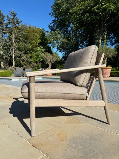 David Deep Seating Lounge Chair Stained Brushed Teak by Vincent Sheppard The David lounge chair in aged teak with woven back and rope details is perfect for adding a refined look to its surroundings. In addition pair with the David side table to create a cosy outdoor lounge spot. aged teak, polypropylene rope removable cover, seat cushion: 12 cm Quick Dry foam filling, back: polyester fibre, cushions with piping.