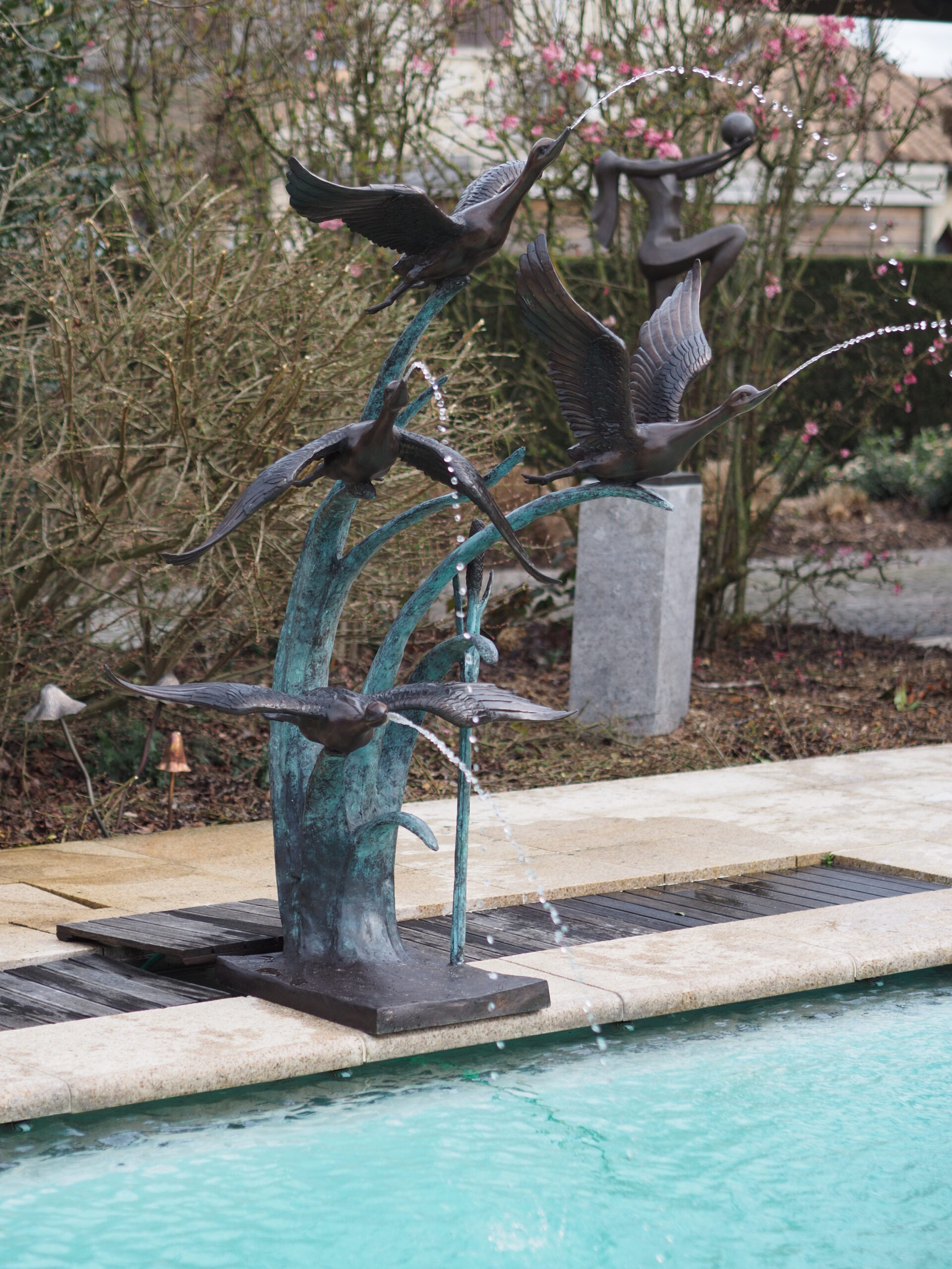 All four ducks operate as working fountains, each spurting water to enhance the feeling of energy and life. Despite the complexity of the design, the water system is neatly integrated, keeping pipework hidden and the sculpture visually clean.