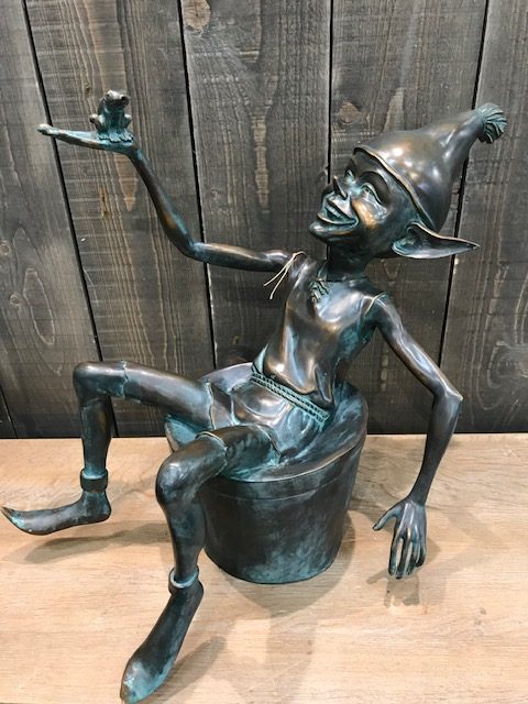 This Goblin in a Bucket Bronze Garden Art Sculpture Fountain Water Feature Would look lovely in any garden. He would also make a thoughtful gift for a friend on a Birthday, a Golden Anniversary or Special Occasion. This Bronze Sculpture Fountain Water Feature comes with copper pipe running through it. A bronze male end connector. All good Aquatic Shops will sell clear pond hose to attach to your pump. A good tip in case the hose is a little tight. Place it in hot water for a few minutes which will make it supple. Then using a jubilee clip secure the hose onto the male end connector.
