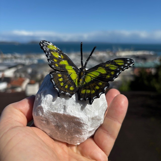 Mounted on a natural quartz stone, the sculpture has a stable and balanced base. The contrast between the green wings and pale stone creates a clean and refined look. In addition, the compact size allows it to sit comfortably in a wide range of spaces.