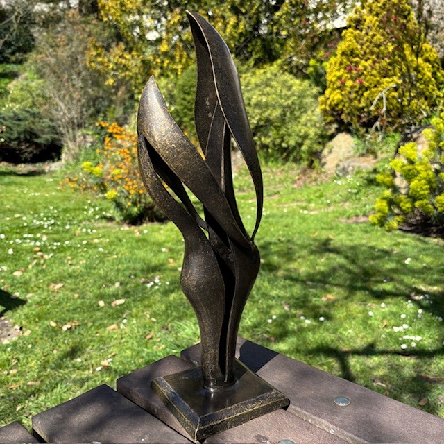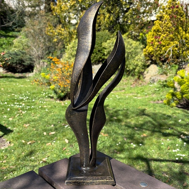 The bronze finish gives the sculpture warmth and depth, while the open form allows light to pass through the piece. This creates changing shadows and shapes throughout the day, giving the sculpture a gentle sense of movement.