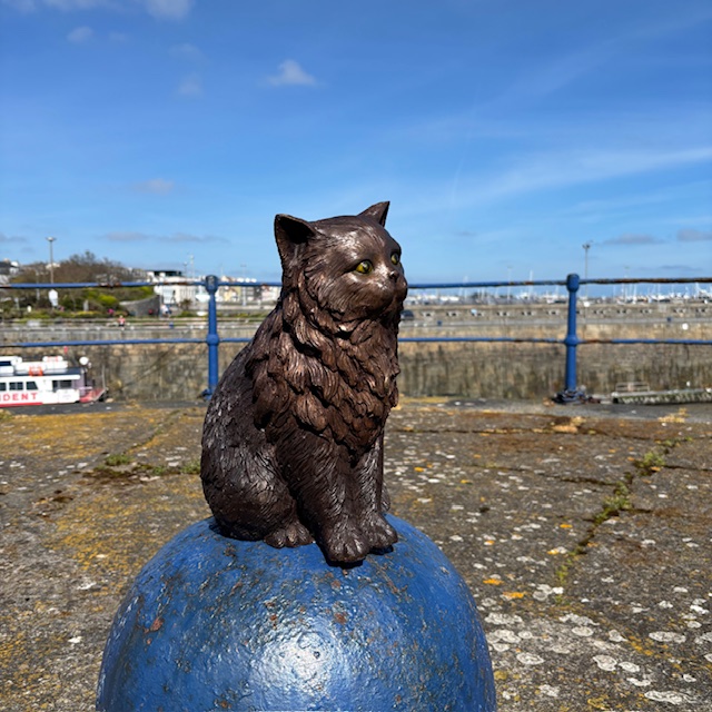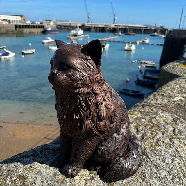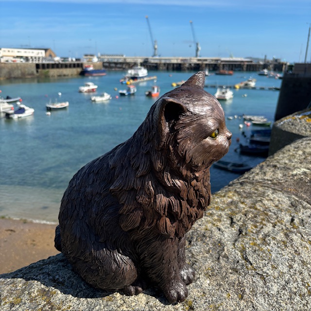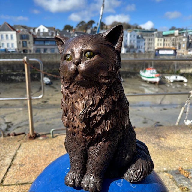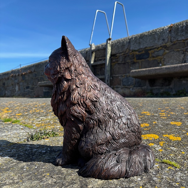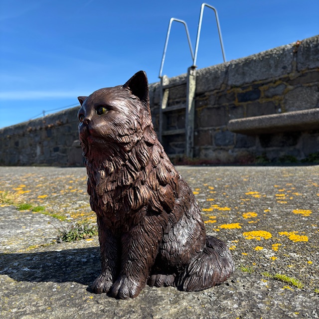 The sculpture features a full, lavish coat and a calm seated posture. Because of this, it reflects the relaxed yet regal nature of Persian cats.
