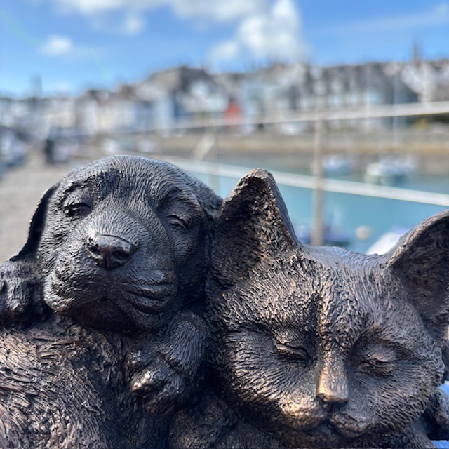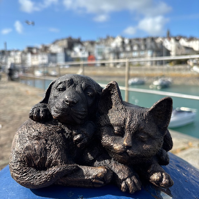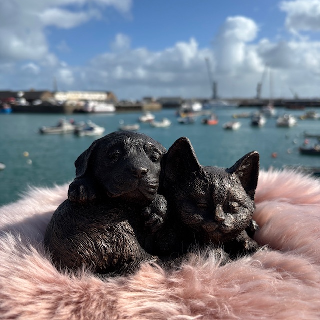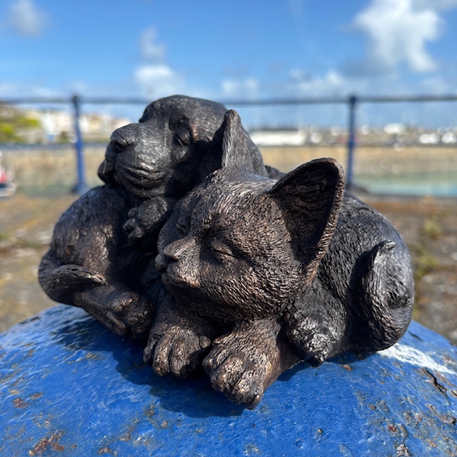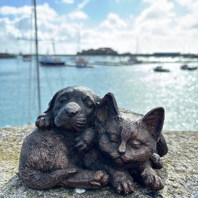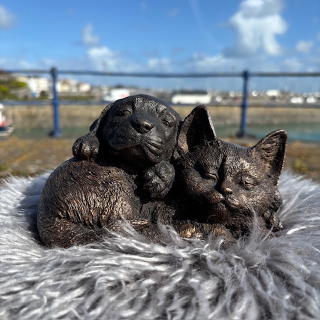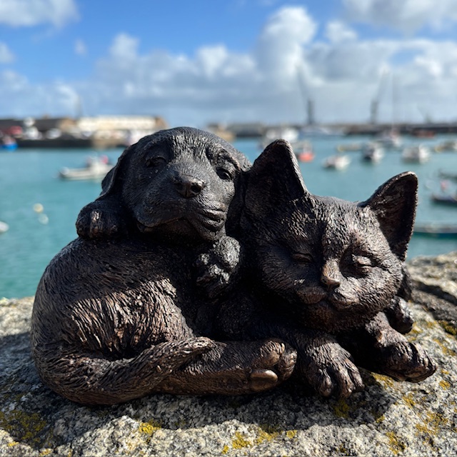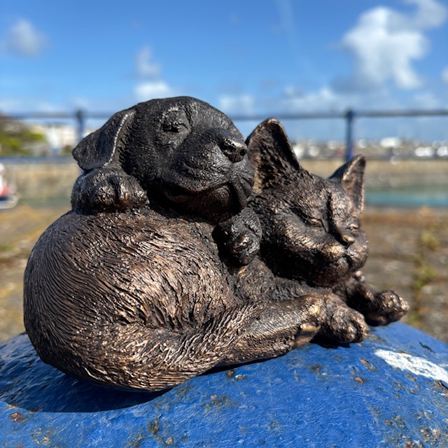 The puppy and kitten lie closely together in a peaceful sleeping pose. Because of this, the sculpture expresses comfort, trust, and companionship.