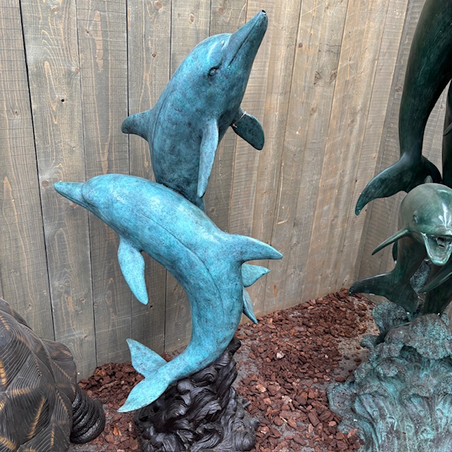 This Verdigris Dolphin Pair Fountain Bronze Water Feature Sculpture is simply Stunning. Consequently creating an amazing water display and garden pond feature. Add a touch of magic to your garden with this very beautiful sculpture. Bronze Sculpture Fountain Dolphins Dancing water feature will last a lifetime in any outdoor situation.
