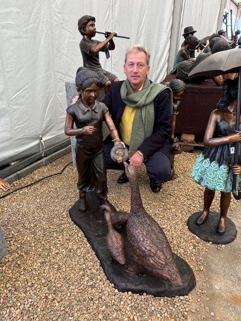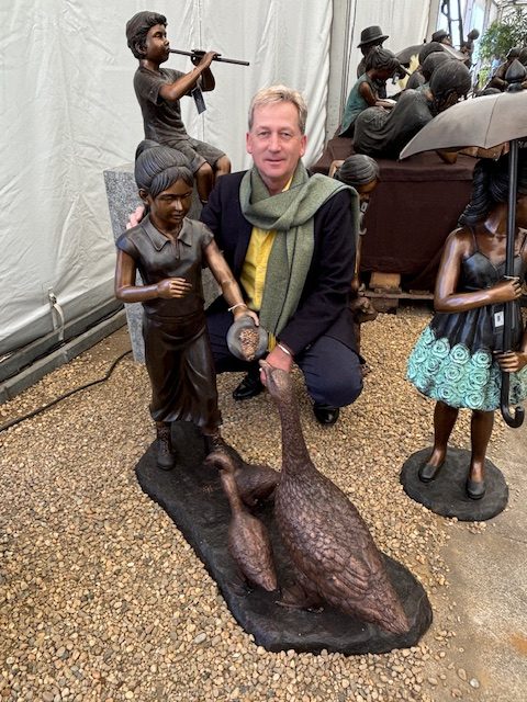 This bronze sculpture portrays a young girl quietly feeding a mother goose and her two goslings. The scene feels calm and natural, capturing a moment of trust between child and wildlife. Rather than dramatic movement, the composition relies on closeness and interaction to convey meaning.